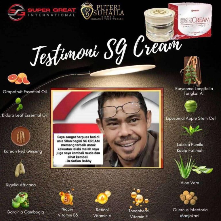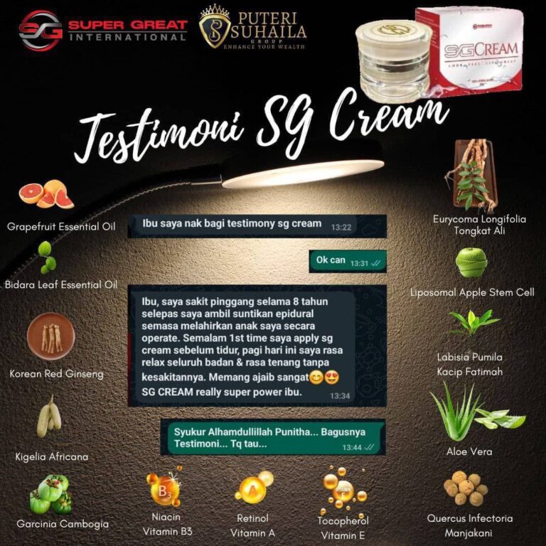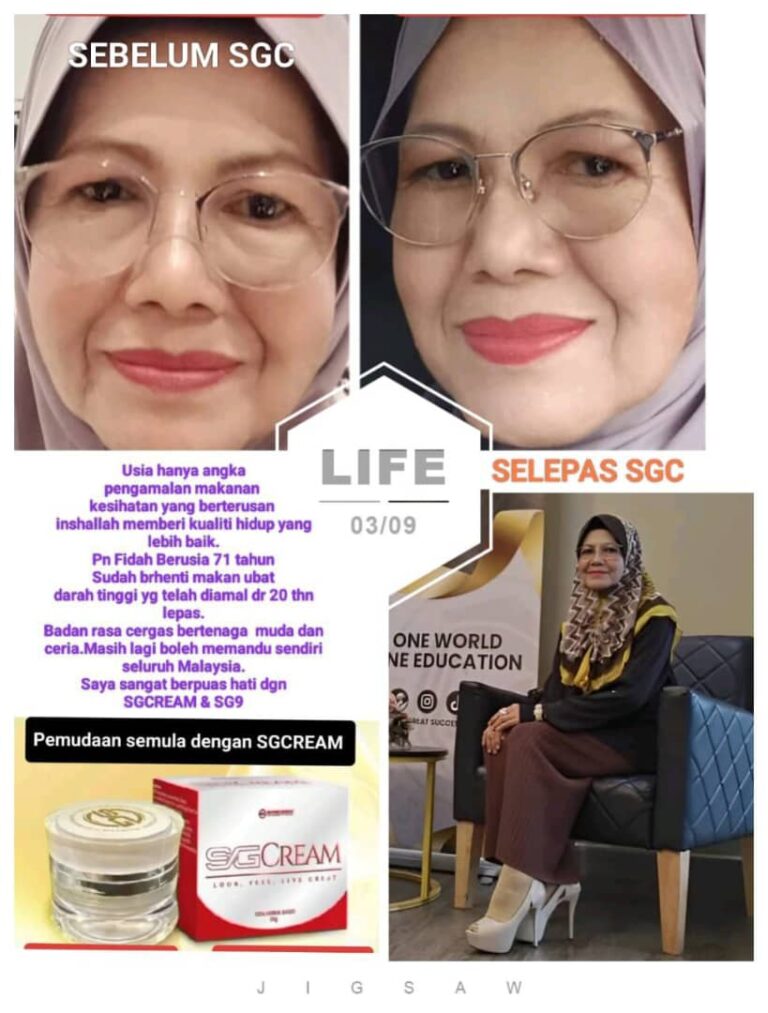 “Saya ada masalah lutut lama. Lepas amal sapu SG Cream, alhamdulillah rasa ringan & boleh bergerak lebih mudah. Bonusnya → orang sekeliling asyik cakap muka nampak muda balik!” – Encik Razak, 55 tahun